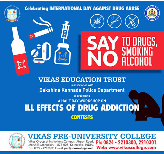 ಮಂಗಳೂರು,ಜೂನ್ .25: ಮಾದಕ ದ್ರವ್ಯ ಸೇವನೆ ಭಾರತದಲ್ಲೂ ವ್ಯಾಪಕವಾಗಿ ಹಬ್ಬುತ್ತಿದೆ. ಯುವ ಜನೆತೆಗೆ ಅದು ತಮ್ಮನ್ನು ಉಲ್ಲಾಸಿತರಾಗಿ ಇರುವಂತೆ ಮಾಡುವ ಮೋಜಿನ ವಸ್ತುವಾಗಿದೆ. ಅದರ ದೂರಗಾಮಿ ದುಷ್ಪರಿಣಾಮಗಳು ಗೊತ್ತಿದ್ದರೂ ಅವನ್ನು ಗಂಭೀರವಾಗಿ ಗಣನೆಗೆ ತೆಗೆದುಕೊಳ್ಳುತ್ತಿಲ್ಲ. ಈ ಹಿನ್ನಲೆಯಲ್ಲಿ ವಿಕಾಸ್ ಪದವಿ ಪೂರ್ವ ಕಾಲೇಜು, ಮಂಗಳೂರು. ಮಾದಕ ದ್ರವ್ಯಗಳ ಸೇವನೆಯಿಂದಾಗುವ ಪರಿಣಾಮಗಳ ಕುರಿತು ಅರಿವು ಮೂಡಿಸುವ ಜಾಗೃತಿ ಕಾರ್ಯಕ್ರಮವೊಂದನ್ನು ಹಮ್ಮಿಕೊಂಡಿದೆ. ಈವೊಂದು ಕಾರ್ಯಕ್ರಮವು ದಕ್ಷಿಣ ಕನ್ನಡ ಪೊಲೀಸ್ ಇಲಾಖೆಯ ಸಹಗೋಗದೊಂದಿಗೆ ದಿನಾಂಕ 27-06-2015 ಶನಿವಾರ ಮಧ್ಯಾಹ್ನ 2.45 ಕ್ಕೆ ‘ಅಂತರಾಷ್ಟ್ರೀಯ ಮಾದಕ ಮುಕ್ತ ದಿನ’ದ ಪ್ರಯುಕ್ತವಾಗಿ ಕೆಲವೊಂದು ಕಾರ್ಯಕ್ರಮಗಳ ನಡೆಯಲಿದೆ. ದಕ್ಷಿಣ ಕನ್ನಡ ಜಿಲ್ಲಾ ಪೊಲೀಸ್ ಅಧೀಕ್ಷಕರಾದ ಡಾ. ಶರಣಪ್ಪ ಮುಖ್ಯ ಅತಿಥಿಗಳಾಗಿ ಆಗಮಿಸಲಿದ್ದಾರೆ.