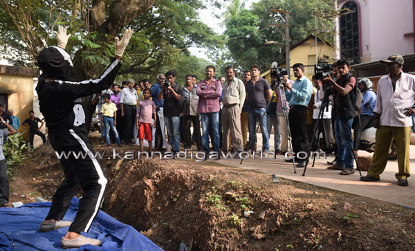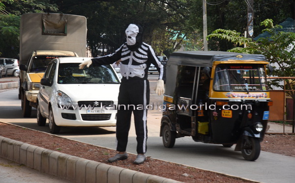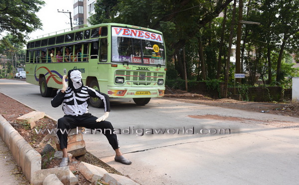 ಅಪಾಯಕಾರಿ ರಸ್ತೆಯಲ್ಲಿ ಜೀವ ಕಳೆದುಕೊಂಡ ವ್ಯಕ್ತಿಯ ಆಸ್ಥಿಪಂಜರ ಕಿರುಚಿಕೊಂಡು ಆಳುವ ರೀತಿ ನಟಿಸಿ ಕದ್ರಿ ಮಲ್ಲಿಕಟ್ಟೆಯ ಸುತ್ತಮುತ್ತ ಈ ವಿಶೇಷ ಪ್ರತಿಭಟನೆ ನಡೆಸಲಾಯಿತು. ನಗರದ ಸುತ್ತಮುತ್ತಲಿನ ಅನಧಿಕೃತ ತಿರುವು, ರೋಡ್ ಕಟ್ಟಿಂಗ್, ಚರಂಡಿ ಹಾಗೂ ಒಳಚರಂಡಿ ನಿರ್ವಹಣೆ ಅವ್ಯವಸ್ಥೆ ವಿರೋಧಿಸಿ ಇಂತಹ ವಿಲಕ್ಷಣ ಪ್ರತಿಭಟನೆ ಮೂಲಕ ಗಮನ ಸೆಳೆದರು.