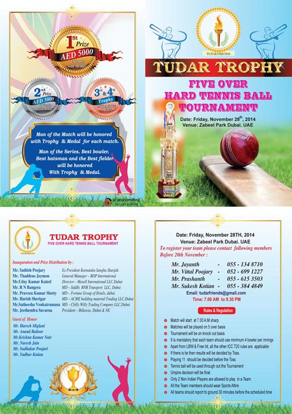 ದುಬೈ, ನ.15: ತುಡಾರ್ ಫ್ರೆಂಡ್ಸ್ ದುಬೈ ಇವರ ಆಶ್ರಯದಲ್ಲಿ ದುಬೈಯ ಜಬೀಲ್ ಪಾರ್ಕ್ನಲ್ಲಿ ನ.28ರಂದು ಐದು ಓವರ್ಗಳ ಹಾರ್ಡ್ ಟೆನ್ನಿಸ್ಬಾಲ್ನ ಕ್ರಿಕೆಟ್ ಪಂದ್ಯಾಟ ನಡೆಯಲಿದೆ.