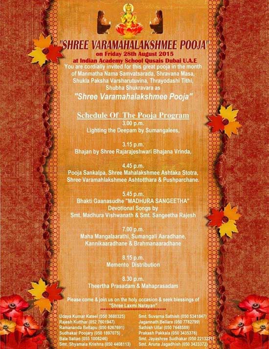 ದುಬಾಯಿಯಲ್ಲಿ ಶ್ರೀ ವರ ಮಹಾಲಕ್ಷ್ಮೀ ಸಮಿತಿಯ ಸುಮಂಗಲೆಯರು ಒಟ್ಟು ಸೇರಿ ಕಳೆದ ಎಂಟು ವರ್ಷಗಳಿಂದ ಆಚರಿಸಿಕೊಂಡು ಬರುತ್ತಿದ್ದ ಶ್ರೀ ವರಮಹಾಲಕ್ಷ್ಮೀ ಪೂಜೆ ಈ ಬಾರಿ ದುಬಾಯಿ ಗಿಸೆಸ್ ನಲ್ಲಿರುವ ಇಂಡಿಯನ್ ಅಕಾಡೆಮಿ ಸ್ಕೂಲ್ ಸಭಾಂಗಣದಲ್ಲಿ 2015 ಆಗಸ್ಟ್ 28 ನೇ ತಾರೀಕು ಶುಕ್ರವಾರ ಸಂಜೆ 3.00 ಗಂಟೆಯಿಂದ ನಡೆಯಲಿದೆ.