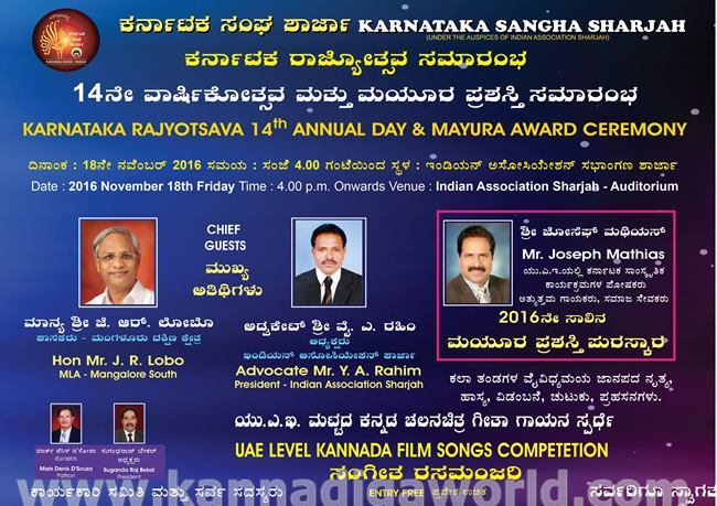 ಅರಬ್ ಸಂಯುಕ್ತ ಸಂಸ್ಥಾನದ ಶಾರ್ಜಾ ವಿಭಾಗದಲ್ಲಿ ಕಳೆದ ಹದಿನಾಲ್ಕು ವರ್ಷಗಳಿಂದ ಕನ್ನಡ ಪರ ಚಟುವಟಿಕೆಗಳನ್ನು ನಡೆಸಿಕೊಂಡು ಬರುತಿರುವ ಶಾರ್ಜಾ ಕರ್ನಾಟಕ ಸಂಘ ಯು.ಎ.ಇ.ಯಲ್ಲಿ ಸಾಧನೆ ಮಾಡಿರುವ ಕನ್ನಡಿಗರನ್ನು ಆಯ್ಕೆಮಾಡಿ ಪ್ರತಿಷ್ಠಿತ “ಮಯೂರ ಪ್ರಶಸ್ತಿ”ಯನ್ನು ಪ್ರದಾನಿಸಿ ಗೌರವಿಸಿಕೊಂಡು ಬರುತಿದೆ. ಈ ಬಾರಿ ಶ್ರೀ ಜೋಸೆಫ್ ಮಥಿಯಸ್ ರವರಿಗೆ ನೀಡಿ ಗೌರವಿಸಲಾಗುತಿದೆ. ಶ್ರೀಯುತರು ಸುಮಧುಅರ ಕಂಠಸಿರಿಯ ಗಾಯಕರಾಗಿ, ನಟರಾಗಿ, , ಸಮಾಜ ಸೇವಕರಾಗಿ, ಯು.ಎ.ಇ. ಯಲ್ಲಿ ನಡೆಯುವ ಎಲ್ಲಾ ಕರ್ನಾಟಕ ಪರ ಸಂಘಟನೆಗಳ ವೈವಿಧ್ಯಮಯ ಸಾಂಸ್ಕೃತಿಕ ಕಾರ್ಯಕ್ರಮಗಳಿಗೆ ಸದಾ ಬೆಂಬಲ ಪೊತ್ಸಾಹ, ಪ್ರಾಯೋಜಕತ್ವ ನೀಡಿ ಗಲ್ಫ್ ನಾಡಿನಲ್ಲಿ ಕರ್ನಾಟಕದ ಕಲೆ, ಭಾಷೆ, ಸಂಸ್ಕೃತಿ ಸದಾ ವಿಜೃಂಭಿಸುವಲ್ಲಿ ನೀಡಿರುವ ಕೊಡುಗೆ ಅಪಾರವಾಗಿದೆ.