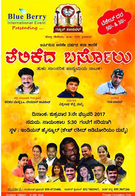 ಯುಎಇ: ಇಲ್ಲಿನ ‘ಗಮ್ಮತ್ ಕಲಾವಿದೆರ್’ ತಂಡದ ಆಶ್ರಯದಲ್ಲಿ ಫೆಬ್ರವರಿ 3 ರಂದು ಸಂಜೆ 5.30ಕ್ಕೆ ‘ತೆಲಿಕೆದ ಬರ್ಸಲು’ ನಾಟಕವನ್ನು ಶೇಕ್ ರಾಶಿದ್ ಆಡಿಟೋರಿಯಂನಲ್ಲಿ ಆಯೋಜಿಸಲಾಗಿದೆ.