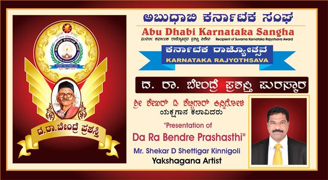 2017ನೇ ಸಾಲಿನ “ದ. ರಾ. ಬೇಂದ್ರೆ ಪ್ರಶಸ್ತಿ” ಯನ್ನು ಅರಬ್ ಸಂಯುಕ್ತ ಸಂಸ್ಥಾನದಲ್ಲಿ ಕರಾವಳಿ ಕರ್ನಾಟಕದ ಗಂಡುಕಲೆ ಯಕ್ಷಗಾನವನ್ನು ಇಲ್ಲಿ ನೆಲೆಸಿರುವ ಹವ್ಯಾಸಿ ಕಲಾವಿದರನ್ನು ಮತ್ತು ಮಕ್ಕಳ ತಂಡವನ್ನು ಪೂರ್ಣ ಪ್ರಮಾಣದಲ್ಲಿ ಶಾಸ್ತ್ರೀಯವಾಗಿ ತಯಾರುಗೊಳಿಸಿ ಯಕ್ಷಗಾನ ಪ್ರದರ್ಶನವನ್ನು ಹಲವಾರು ವರ್ಷಗಳಿಂದ ಯಶಸ್ವಿಯಾಗಿ ನಡೆಸಿಕೊಂಡು ಬಂದಿರುವ ಅತ್ಯುತ್ತಮ ಯಕ್ಷಗಾನ ಕಲಾವಿದರು, ಗುರುಗಳು, ನಿರ್ದೇಶಕರು ಶ್ರೀ ಶೇಖರ್ ದಾಮೋದರ ಶೆಟ್ಟಿಗಾರ್ ಕಿನ್ನಿಗೋಳಿ ಇವರಿಗೆ ನೀಡಿ ಸನ್ಮಾನಿಸಿ ಗೌರವಿಸಲಾಗುವುದು.