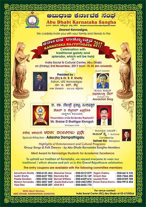ದುಬೈ:ಅಬುಧಾಬಿ ಕರ್ನಾಟಕ ಸಂಘದ ವತಿಯಿಂದ ಕರ್ನಾಟಕ ರಾಜ್ಯೋತ್ಸವವು ನವಂಬರ್ 3ರಂದು ಬೆಳಿಗ್ಗೆಯಿಂದ ಸಂಜೆಯ ವರೆಗೆ ಅಬುದಾಬಿಯ ಇಂಡಿಯ ಸೋಶಿಯಲ್ ಆಂಡ್ ಕಲ್ಚರಲ್ ಸೆಂಟರ್ ನಲ್ಲಿ ವಿವಿಧ ಸಾಂಸ್ಕೃತಿಕ ಕಾರ್ಯಕ್ರಮಗಳೊಂದಿಗೆ ಜರಗಲಿದೆ.