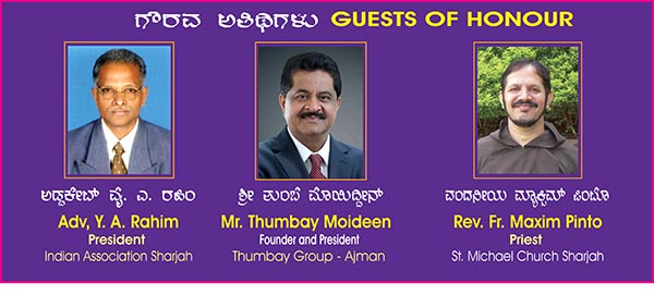 ಸಮಾರಂಭದ ಮುಖ್ಯ ಅತಿಥಿಗಳಾಗಿ ಯು.ಎ.ಇ. ಕನ್ನಡಿಗರ ಮಹಾಪೋಷಕರಾದ ಡಾ. ಬಿ. ಆರ್. ಶೆಟ್ಟಿಯವರು ಮತ್ತು ಗೌರವ ಅತಿಥಿಗಳಾಗಿ ಇಂಡಿಯನ್ ಅಸೋಸಿಯೇಶನ್ ಶಾರ್ಜಾ ಅಧ್ಯಕ್ಷರಾದ ಅಡ್ವಕೇಟ್ ವೈ. ಎ. ರಹಿಂ, ತುಂಬೆ ಗ್ರೂಪ್ ನ ಸ್ಥಾಪಕರು ಮತ್ತು ಅಧ್ಯಕ್ಷರಾಗಿರುವ ಶ್ರೀ ತುಂಬೆ ಮೊಯಿದ್ದೀನ್ ಹಾಗೂ ಶಾರ್ಜಾ ಸಂತ ಮೈಕೆಲರ ಇಗರ್ಜಿಯ ಧರ್ಮಗುರುಗಳಾದ ವಂದನೀಯ ಮ್ಯಾಕ್ಸಿಂ ಪಿಂಟೊ ರವರು ಪಾಲ್ಗೊಳ್ಳಲಿದ್ದಾರೆ.