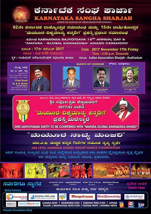 ಕರ್ನಾಟಕ ಸಂಘ ಶಾರ್ಜಾ ತನ್ನ 15ನೇ ವಾರ್ಷಿಕೋತ್ಸವ, 62ನೇ ಕರ್ನಾಟಕ ರಾಜ್ಯೋತ್ಸವ ಮತ್ತು ಮಯೂರ ಪ್ರಶಸ್ತಿ ಪ್ರಧಾನ ಸಮಾರಂಭ 2017 ನವೆಂಬರ್ 17ನೇ ತಾರೀಕು ಶುಕ್ರವಾರ ಸಂಜೆ 4.00 ಗಂಟೆಯಿಂದ ಶಾರ್ಜಾ ಇಂಡಿಯನ್ ಅಸೋಸಿಯೇಶನ್ ಬೃಹತ್ ಸಭಾಂಗಣದಲ್ಲಿ ಅಯೋಜಿಸಲಾಗಿದೆ.
