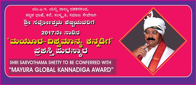 2017ನೇ ಸಾಲಿನ ಪ್ರತಿಷ್ಠಿತ “ಮಯೂರ- ವಿಶ್ವ ಕನ್ನಡಿಗ ಪ್ರಶಸ್ತಿ” ಶ್ರೀ ಸರ್ವೋತ್ತಮ ಶೆಟ್ಟಿಯವರಿಗೆ ಪ್ರಧಾನ
