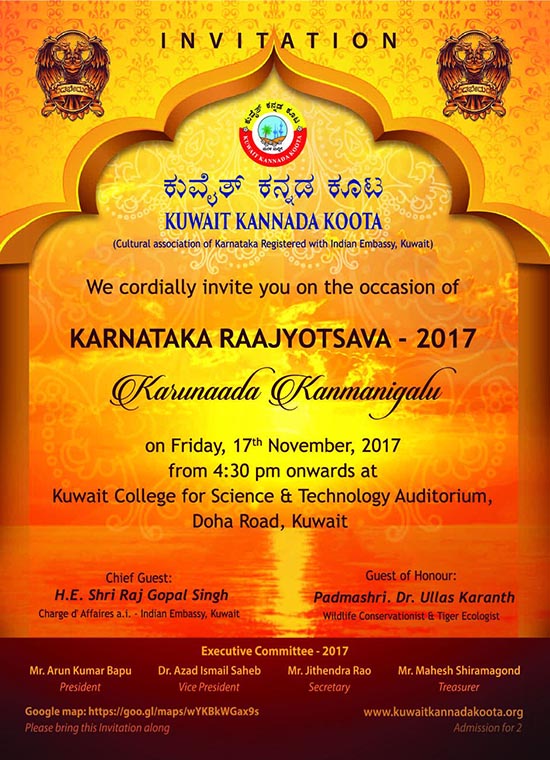 ವರ್ಷ 2017 ರ ಕಾರ್ಯಕಾರಿ ಸಮಿತಿಯ ಅಧ್ಯಕ್ಷರಾಗಿ ಶ್ರೀ ಅರುಣ್ ಕುಮಾರ್ ಬಾಪು, ಉಪಾಧ್ಯಕ್ಷರಾಗಿ ಡಾ. ಆಜಾದ್ ಇಸ್ಮಾಯಿಲ್ ಸಾಹೇಬ್, ಕಾರ್ಯದರ್ಶಿಗಳಾಗಿ ಶ್ರೀ ಜಿತೇಂದ್ರ ರಾವ್ ಮತ್ತು ಖಜಾಂಚಿಗಳಾಗಿ ಶ್ರೀ ಮಹೇಶ್ ಶೀರಾಮಗೊಂಡ್ ಅಯ್ಕೆಯಾಗಿದ್ದಾರೆ. ಪ್ರತಿವರ್ಷದಂತೆ ಈ ವರ್ಷವೂ ನಮ್ಮ ಹೆಮ್ಮೆಯ ರಾಜ್ಯೋತ್ಸವವನ್ನು ನವಂಬರ್ 17 ರಂದು Kuwait College of Science and Technology ಯ ಸಭಾಂಗಣದಲ್ಲಿ ಆಯೋಜಿಸಲಾಗಿದೆ.