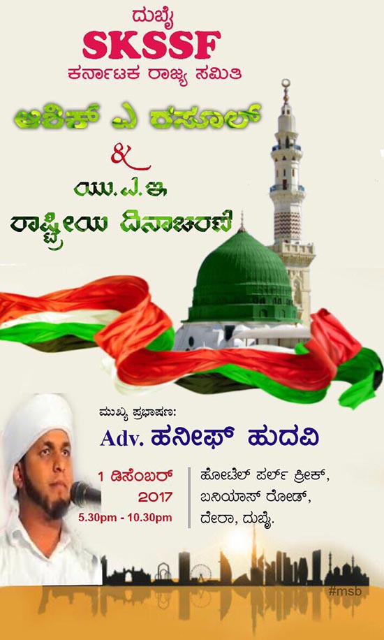 ಲೋಕ ಪ್ರವಾದಿ ಮುಹಮ್ಮದ್ (ಸ ಅ) ರವರ 1492 ನೇ ಜನ್ಮ ದಿನಾಚರಣೆಯ ಅಂಗವಾಗಿ ಹಾಗೂ ಯು ಎ ಇ 46ನೇ ರಾಷ್ಟ್ರೀಯ ದಿನಾಚರಣೆ ಪ್ರಯುಕ್ತ ಅನಿವಾಸಿ ಧಾರ್ಮಿಕ, ಸಾಮಾಜಿಕ, ಶೈಕ್ಷಣಿಕ ಸಂಘಟನೆಯಾದ ಕರ್ನಾಟಕ ಎಸ್ ಕೆ ಎಸ್ ಎಸ್ ಎಫ್ ದುಬೈ ಸಮಿತಿಯು ಬ್ರಹತ್ ಮೀಲಾದ್ ಸಮಾವೇಶವನ್ನು , ಯು ಎ ಇ ರಾಷ್ಟ್ರೀಯ ದಿನಾಚರಣೆ ಡಿಸೆಂಬರ್ 01 ರಂದು ಶುಕ್ರವಾರ ಸಂಜೆ 5.30 ಕ್ಕೆ ಸರಿಯಾಗಿ ಪರ್ಲ್ ಕ್ರೀಕ್ ಹೋಟೆಲ್ ಸಭಾಂಗಣದಲ್ಲಿ ನಡೆಯಲಿದೆ.