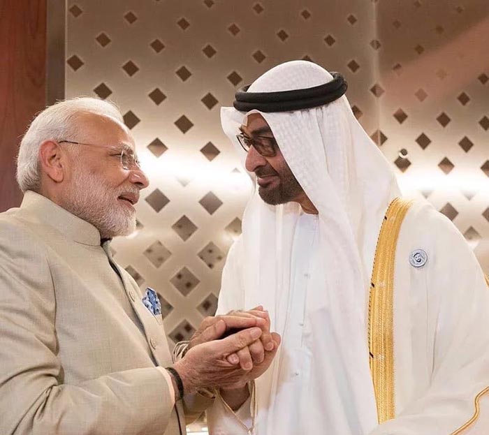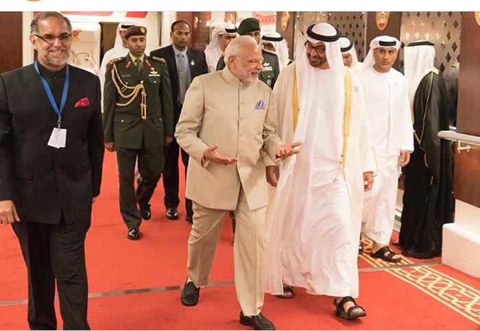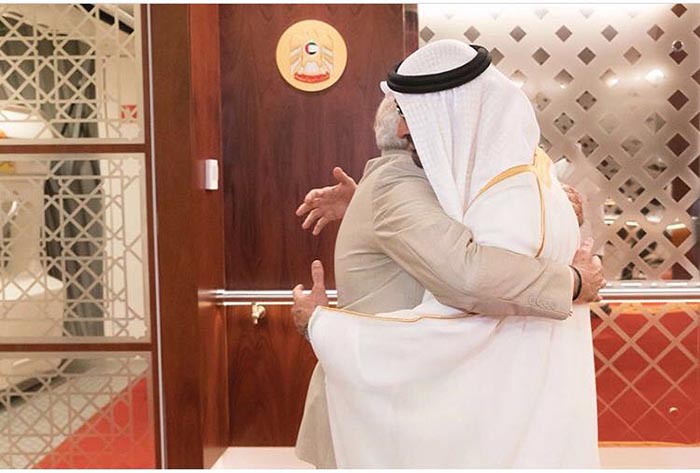 ಶನಿವಾರ ಅಬುಧಾಬಿಗೆ ಆಗಮಿಸಿದ ಪ್ರಧಾನಿ ಮೋದಿಯವರನ್ನು ಅಬುಧಾಬಿಯ ಯುವರಾಜ ಶೇಖ್ ಮೊಹಮ್ಮದ್ ಬಿನ್ ಝಯೆದ್ ಅಲ್ ನಹ್ಯಾನ್ ಆತ್ಮೀಯವಾಗಿ ಬರಮಾಡಿಕೊಂಡರು.