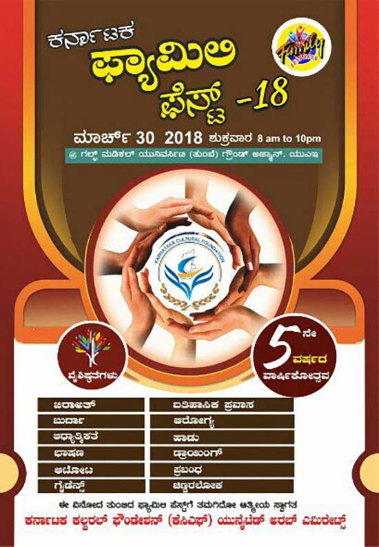 ದುಬೈ: ಕರ್ನಾಟಕ ಕಲ್ಚರಲ್ ಫೌಂಡೇಶನ್ (ಕೆಸಿಎಫ್) ಐದನೇ ವರ್ಷಾಚರಣೆಯ ಪ್ರಯುಕ್ತ ಗಲ್ಫ್ ಅನಿವಾಸಿ ಕನ್ನಡಿಗರ ‘ಕರ್ನಾಟಕ ಫ್ಯಾಮಿಲಿ ಫೆಸ್ಟ್-18’  ಮಾ. 30 ರಂದು ಅಜ್ಮಾನ್ ಗಲ್ಫ್ ಮೆಡಿಕಲ್ ಯೂನಿವರ್ಸಿಟಿ (ತುಂಬೆ ಮೈದಾನ) ಯಲ್ಲಿ ನಡೆಯಲಿದೆ.
