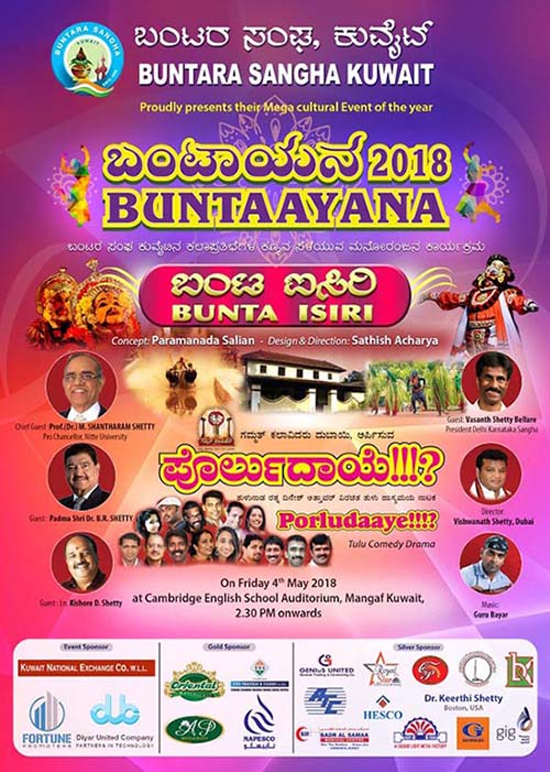 ಕುವೈತ್: ಬಂಟರ ಸಂಘ, ಕುವೈತ್ ಇವರ ಭಾರಿ ನಿರೀಕ್ಷೆಯ ವಾರ್ಷಿಕ ಬೃಹತ್ ಸಾಂಸ್ಕೃತಿಕ ಕಾರ್ಯಕ್ರಮ ’ಬಂಟಾಯನ 2018’ ಇದೇ ಬರುವ ಮೇ 4, ಶುಕ್ರವಾರ, 2018 ರಂದು ಮಂಗಾಫ್ ನ ಕೇಂಬ್ರಿಡ್ಜ್ ಇಂಗ್ಲೀಷ್ ಶಾಲೆಯ ಸಭಾಂಗಣದಲ್ಲಿ ನೆಡೆಯಲಿರುವುದು.
