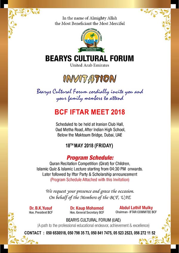 ಈ ವಿಶೇಷವಾದ BCF ಇಫ್ತಾರ್ ಕಾರ್ಯಕ್ರಮಕ್ಕೆ ಎಲ್ಲ ಕನ್ನಡಿಗ ಹಾಗೂ ಕನ್ನಡೇತರ ಭಂದುಗಳು ಹಾಗೂ UAEಯಲ್ಲಿ ಇರುವ ಎಲ್ಲಾ ಕನ್ನಡ ಪರ ಸಮಾಜ ಸೇವಾ ಸಂಸ್ಥೆಗಳ ಪ್ರತಿನಿಧಿಗಳು ಹಾಗೂ ಸದಸ್ಯರನ್ನು BCF ಪರವಾಗಿ BCF ಇಫ್ತಾರ್ ಕಮಿಟಿ ಯ ಚಯರ್ಮನ್ ಜ: ಅಬ್ದುಲ್ ಲತೀಫ್ ಮುಲ್ಕಿ ಹಾಗೂ ಸದಸ್ಯರು ವಿನಮ್ರವಾಗಿ ಆಹ್ವಾನಿಸಿದ್ದಾರೆ. ಭಾಗವಹಿಸುವ ಸಮಾಜ ಸೇವಾ ಸಂಸ್ಥೆಗಳು ಕಾರ್ಯಕ್ರಮಕ್ಕೆ ಬಂದ ತಕ್ಷಣ ತಮ್ಮ ಸಂಸ್ಥೆಯ ಹೆಸರನ್ನು ಮತ್ತು ತಮ್ಮ ಹೆಸರನ್ನು ತಿಳಿಸಿ ನೋಂದಾಯಿಸ ವಿಶೇಷವಾಗಿ ವಿಶೇಷವಾಗಿ ವಿನಂತಿಸಲಾಗಿದೆ.