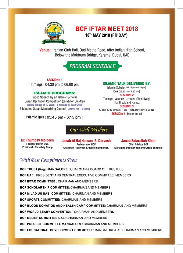 UAEಯ ಪ್ರತಿಷ್ಠಿತ ಸಮಾಜ ಸೇವಾ ಸಂಸ್ಥೆ ಬ್ಯಾರೀಸ್ ಕಲ್ಚರಲ್ ಫೋರಮ್ ( ಬಿಸಿಫ್) ಇದರ ವತಿಯಿಂದ ಪ್ರತೀ ವರ್ಷ ಆಯೋಜಿಸಲ್ಪಡುವ ಇಫ್ತಾರ್ ಕಾರ್ಯಕ್ರಮ ” BCF IFTAAR MEET 2018 ” ಈ ವರ್ಷ ಇದೇ ಬರುವ ಮೇ 18 ನೇ ತಾರೀಕಿನಂದು ಶುಕ್ರವಾರ ದುಬೈ ಊದ್ ಮೆಹ್ತಾ ರೋಡ್ ನಲ್ಲಿರುವ ಇರಾನಿಯನ್ ಕ್ಲಬ್ ಸಭಾಂಗಣದಲ್ಲಿ (ಇಂಡಿಯನ್ ಹೈ ಸ್ಕೂಲ್ ಹತ್ತಿರ) ನಡೆಸಲಾಗುವುದು. ಕನ್ನಡಿಗ ಮತ್ತು ಕನ್ನಡೇತರ ಭಾಂದವರು ತಮ್ಮ ಕುಟುಂಬ ಸಮೇತರಾಗಿ ಸೇರುವ ಈ ಕಾರ್ಯಕ್ರಮಕ್ಕೆ ಸುಮಾರು 800 ರಷ್ಟು ಜನ ಸಮುಹ ಸೇರುವ ನಿರೀಕ್ಷೆ ಇದೆ.