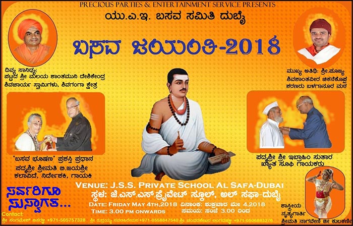 ಯುನೈಟೆಡ್ ಅರಬ್ ಎಮಿರೇಟ್ಸ್ ನ ದುಬೈ ಮಹಾನಗರದ ಅಲ್ -ಸಫಾದಲ್ಲಿರುವ ಜೆ. ಎಸ್ .ಎಸ್ ಪ್ರೈವೇಟ್ ಸ್ಕೂಲ್ ಸಭಾಂಗಣದಲ್ಲಿ ಮೇ 4, 2018ರ ಶುಕ್ರವಾರ ಸಂಜೆ 3:00 ಗಂಟೆಯಿಂದ ಯು. ಎ .ಇ ಬಸವ ಸಮಿತಿ ದುಬೈ ಆಚರಿಸಲಿರುವ ‘ಬಸವ ಜಯಂತಿ -2018’ ಸಮಾರಂಭ ಪಟ್ಟದ ಶ್ರೀ ಮಲಯ ಶಾಂತ ಮುನಿ ದೇಶಿಕೇಂದ್ರ ಶಿವಾಚಾರ್ಯ ಸ್ವಾಮಿಗಳು , ಶಿವಗಂಗಾ ಕ್ಷೇತ್ರ ಇವರ ದಿವ್ಯ ಸಾನಿಧ್ಯವಲ್ಲಿ ಜರಗಲಿದೆ.