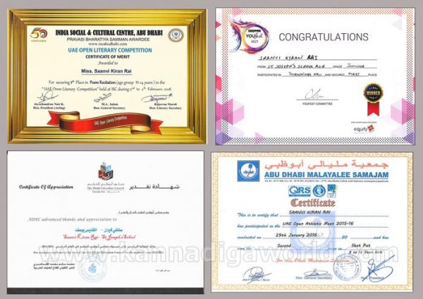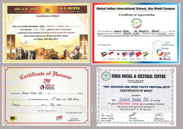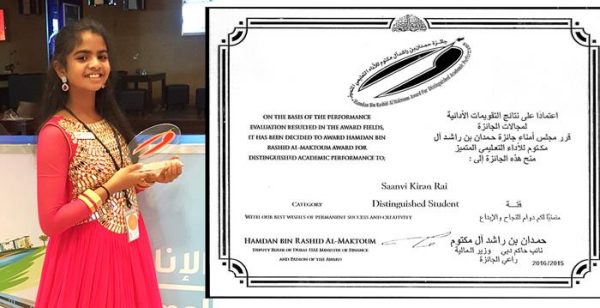 ಯು.ಎ.ಇ.ಯ ಅಬುಧಾಬಿಯಲ್ಲಿ ಸಂತ ಜೋಸೇಫರ ವಿದ್ಯಾಸಂಸ್ಥೆಯಲ್ಲಿ ವ್ಯಾಸಂಗ ಮಾಡುತ್ತಿರುವ ವಿದ್ಯಾರ್ಥಿನಿ 7ನೇ ತರಗತಿಯಲ್ಲಿ ಇರುವಾಗಲೇ ಕು| ಸಾನ್ವಿ ಕಿರಣ್ ರೈ 20 ಏಪ್ರಿಲ್ 2016ರಲ್ಲಿ ಡೆಪ್ಯೂಟಿ ರೂಲರ್ ಆಫ್ ದುಬಾಯಿ ಗೌ| ಶೇಖ್ ಹಮ್ದಾನ್ ಬಿನ್ ರಾಶೀದ್ ಅಲ್ ಮಕ್ತೂಮ್ ಇವರಿಂದ ಪರಿಷ್ಠಿತ “ಶೇಖ್ ಹಮ್ದಾನ್ ಪ್ರಶಸ್ತಿ” ಯನ್ನು ದುಬಾಯಿಯಲ್ಲಿ ಟ್ರೇಡ್ ಸೆಂಟರ್ ಸಭಾಂಗಣದಲ್ಲಿ ವರಣರಂಜಿತ ಪ್ರಶಸ್ತಿ ಪ್ರಧಾನ ಸಮಾರಂಭದಲ್ಲಿ ಪಡೆದುಕೊಂಡಿದ್ದಾಳೆ.
