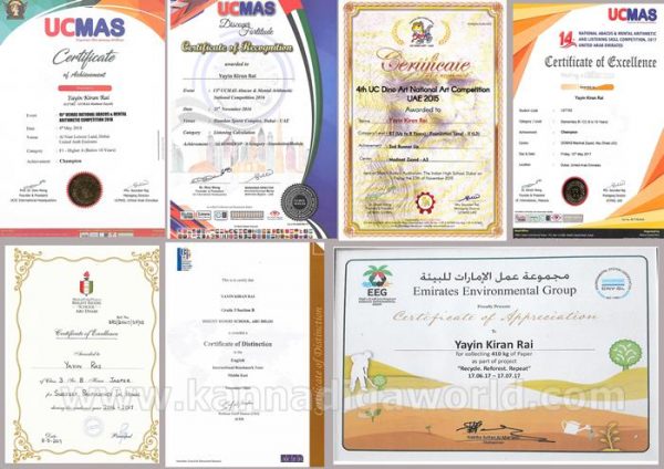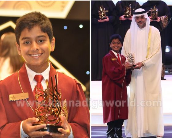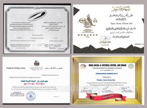 ಯು.ಎ.ಇ.ಯ ಅಬುಧಾಬಿಯ ಮುಸಾಫಾದಲ್ಲಿರುವ ಬ್ರೈಟ್ ರೈಡರ್ಸ್ ವಿದ್ಯಾಸಂಸ್ಥೆಯಲ್ಲಿ 9ನೇ ತರಗತಿಯಲ್ಲಿ ವ್ಯಾಸಂಗ ಮಾಡುತ್ತಿರುವ ವಿದ್ಯಾರ್ಥಿ ಕು| ಯಾಯಿನ್ ಕಿರಣ್ ರೈ 2017-18ನೇ ಸಾಲಿನ “ಶಾರ್ಜಾ ಅವಾರ್ಡ್ ಫಾರ್ ಎಜುಕೇಷನಲ್ ಎಕ್ಸಲೆನ್ಸ್” ಪ್ರಶಸ್ತಿ ಪ್ರತಿಷ್ಠಿತ ವರ್ಣರಂಜಿತ ಸಮಾರಂಭದಲ್ಲಿ ಪಡೆದುಕೊಂಡಿದ್ದಾನೆ. ಸಮಾರಂಭ ಶಾರ್ಜಾ ಎಜುಕೇಶನ್ ಕೌನ್ಸಿಲ್ ಆಶ್ರಯದಲ್ಲಿ 2018 ಮೇ 3ನೇ ತಾರೀಕು ಗುರುವಾರ ಬೆಳಿಗ್ಗೆ 10 ಗಂಟೆಗೆ ಶಾರ್ಜಾ ಯೂನಿವರ್ಸಿಟಿ ಸಿಟಿ ಹಾಲ್ ನಲ್ಲಿ ಅತ್ಯುನ್ನತ ಮಟ್ಟದಲ್ಲಿ ಆಯೋಜಿಸಲಾಗಿತ್ತು.