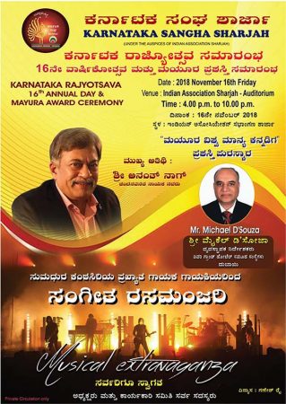 ದುಬೈ: ಕರ್ನಾಟಕ ಸಂಘ ಶಾರ್ಜಾ ತನ್ನ 16ನೇ ವಾರ್ಷಿಕೋತ್ಸವ, ಕರ್ನಾಟಕ ರಾಜ್ಯೋತ್ಸವ ಮತ್ತು ಪ್ರತಿಷ್ಠಿತ ಮಯೂರ ಪ್ರಶಸ್ತಿ ಪ್ರಧಾನ ಸಮಾರಂಭ ನವೆಂಬರ್ 16ನೇ ತಾರೀಕು ಶುಕ್ರವಾರ ಸಂಜೆ 4.00 ಗಂಟೆಗೆ ಶಾರ್ಜಾ ಇಂಡಿಯನ್ ಅಸೋಸಿಯೇಶನ್ ಬೃಹತ್ ಸಭಾಂಗಣದಲ್ಲಿ ಅಯೋಜಿಸಲಾಗಿದೆ.