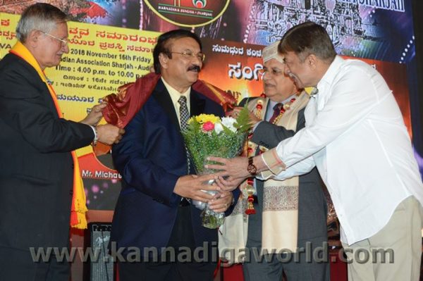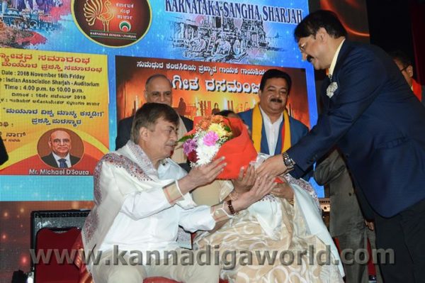 ಯುಎಇಯ ಹೆಸರಾಂತ ಉದ್ಯಮಿ, ದಾನಿ, ಐವರಿ ಗ್ರ್ಯಾಂಡ್ ಹೋಟೆಲ್ ಸಮೂಹ ಸಂಸ್ಥೆಗಳ ವ್ಯವಸ್ಥಾಪಕ ನಿರ್ದೇಶಕ ಮೈಕಲ್ ಡಿಸೋಜ ಅವರಿಗೆ ಶಾರ್ಜಾ ಕರ್ನಾಟಕ ಸಂಘ ಕೊಡಮಾಡುವ ಪ್ರತಿಷ್ಠಿತ ‘ಮಯೂರ ಪ್ರಶಸ್ತಿ’ ನೀಡಿ ಗೌರವಿಸಲಾಯಿತು.