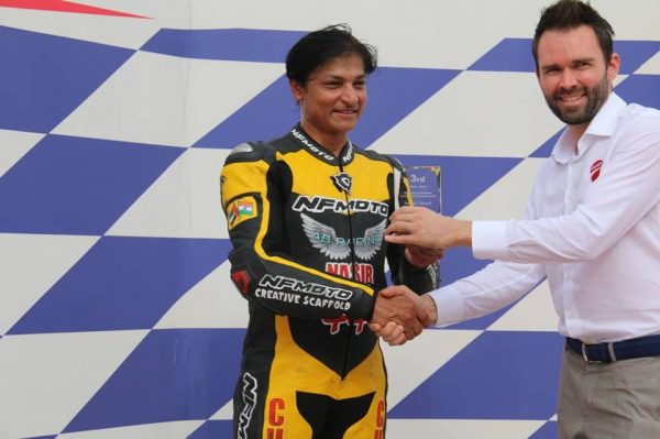 ದುಬೈ : ದುಬೈ ಮೋಟಾರ್ ಸಿಟಿಯಲ್ಲಿ ಅತ್ಯಂತ ರೋಚಕವಾಗಿ ನಡೆದ ಅಂತಾರಾಷ್ಟ್ರೀಯ ಡುಕಾಟಿ ಚಾಂಪಿಯನ್ ಶಿಪ್ ಮೋಟಾರ್ ಬೈಕ್ ರೇಸಿನಲ್ಲಿ ಕನ್ನಡಿಗ ನಾಸಿರ್ ಸೈಯದ್ ತೃತೀಯ ಸ್ಥಾನ ಗೆದ್ದಿದ್ದಾರೆ. 12 ದೇಶದ ಸುಮಾರು 16 ಸ್ಪರ್ಧಿಗಳು ಭಾಗವಹಿಸಿದ್ದ ಈ ರೋಚಕ ಬೈಕ್ ರೇಸಿನಲ್ಲಿ ಭಾರತವನ್ನು ಪ್ರತಿನಿಧಿಸಿದ್ದ ಅನಿವಾಸಿ ಕನ್ನಡಿಗ ನಾಸಿರ್ ಎಲ್ಲಾ ಸ್ಪರ್ಧಿಗಳಿಗೂ ಕಠಿಣ ಸ್ಪರ್ಧೆಯೊಡ್ಡಿ ತೃತೀಯ ಸ್ಥಾನ ಪಡೆಯಲು ಯಶಸ್ವಿಯಾದರು.