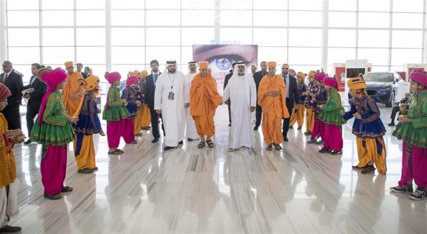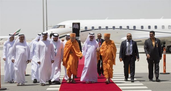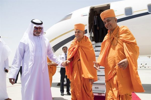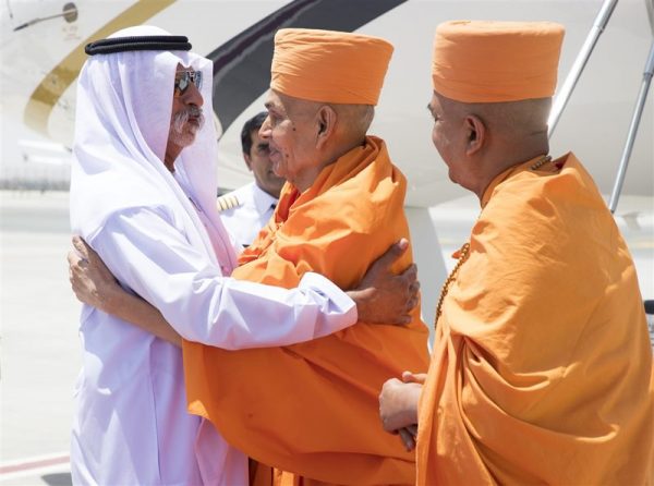 ಅಲ್ ಮಕ್ತುಮ್ ಇಂಟರ್ನ್ಯಾಷನಲ್ ಏರ್ಪೋರ್ಟ್’ಗೆ ಆಗಮಿಸಿದ ಮಹಂತ್ ಸ್ವಾಮಿ ಮಹಾರಾಜ್’ರನ್ನು ಯುಎಇ ಸಚಿವ ಶೇಖ್ ನಹ್ಯಾನ್ ಬಿನ್ ಮುಬಾರಕ್ ಅಲ್ ನಹ್ಯಾನ್ ಅವರು ಆತ್ಮೀಯವಾಗಿ ಬರಮಾಡಿಕೊಂಡರು.