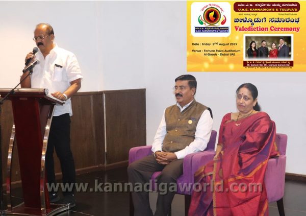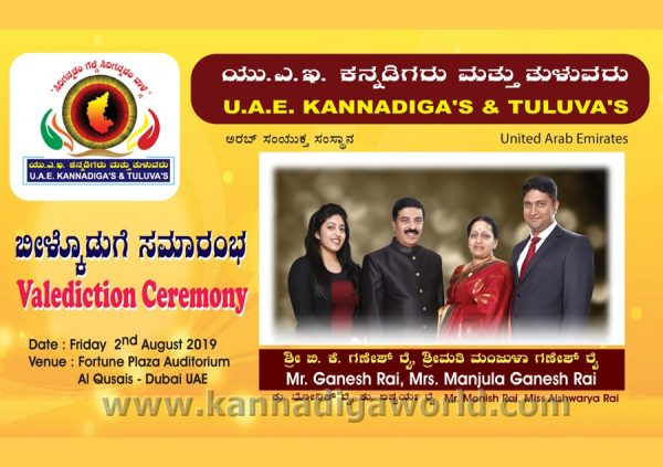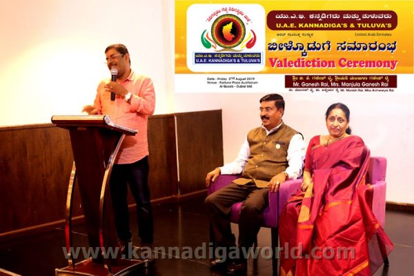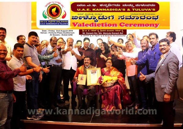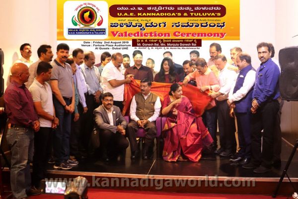 ಕರ್ನಾಟಕದ ಪ್ರಕೃತಿ ಮಡಿಲು ಶೂರರ ನಾಡು ಕೊಡಗು ಜಿಲ್ಲೆಯಿಂದ ಗಲ್ಫ್ ರಾಷ್ಟ್ರಕ್ಕೆ ಬಂದು ಎರಡುವರೆ ದಶಕಗಳ ಕಾಲ ಸೇವೆ ಸಲ್ಲಿಸಿ ತಮ್ಮ ಜನ್ಮಭೂಮಿಗೆ ನಿವೃತ್ತಿಯಾಗಿ ಹಿಂದಿರುಗಲಿರುವ ಕ್ರಿಯಾತ್ಮಕ ಕಲಾ ನಿರ್ದೇಶಕ ಶ್ರೀ ಬಿ. ಕೆ. ಗಣೇಶ್ ರೈಯವರಿಗೆ ಯು.ಎ.ಇ. ಕನ್ನಡಿಗರು ಮತ್ತು ತುಳುವರಿಂದ ಹೃದಯಸ್ಪರ್ಶಿ ಬೀಳ್ಕೊಡುಗೆ ಸಮಾರಂಭ ನಡೆಯಿತು.