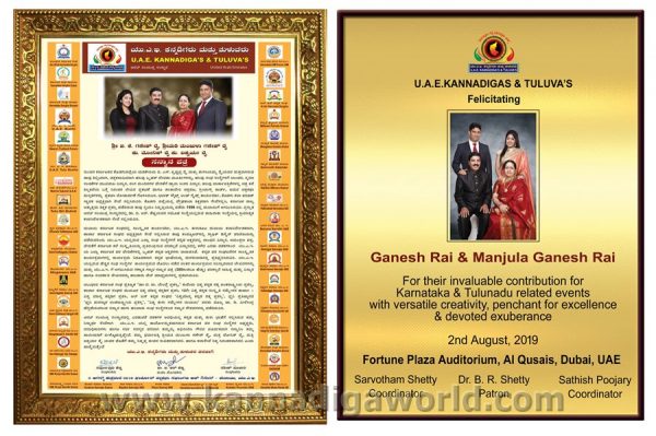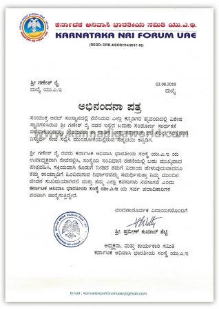 ಯು.ಎ.ಇ. ಕನ್ನಡಿಗರು ಮತ್ತು ತುಳುವರ ಸಂಘಟನೆಯಲ್ಲಿ ಯು.ಎ.ಇ. ಯಲ್ಲಿರುವ ಕರ್ನಾಟಕ ಪರ ಸಂಘಟನೆಗಳ ಅಧ್ಯಕ್ಷರುಗಳು ಹಾಗೂ ಪದಾಧಿಕಾರಿಗಳ ಸಮ್ಮುಖದಲ್ಲಿ ಸನ್ಮಾನಿಸಿ ಗೌರವಿಸಲಾಯಿತು. ಸನ್ಮಾನ ಪ್ರಕ್ರಿಯೆಯನ್ನು ಶ್ರೀ ಸರ್ವೊತ್ತಮ ಶೆಟ್ಟಿ, ಪ್ರೇಂನಾಥ್ ಶೆಟ್ಟಿ, ಬಾಲಕೃಷ್ಣ ಸಾಲಿಯಾನ್ ಮತ್ತು ಸತೀಶ್ ಪೂಜಾರಿಯವರು ನೆರವೇರಿಸಿಕೊಟ್ಟರು ಸನ್ಮಾನ ಪತ್ರವನ್ನು ಶ್ರೀ ಸಂಪತ್ ಶೆಟ್ಟಿಯವರು ವಾಚಿಸಿದರು.