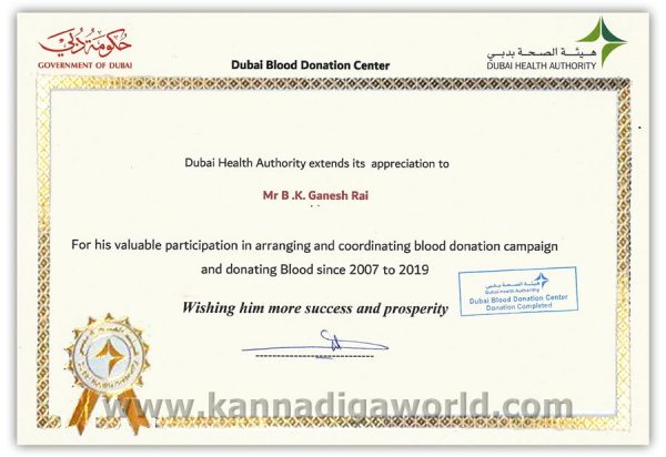 ಗಣೇಶ್ ರೈಯವರು ಶಾರ್ಜಾ ಕರ್ನಾಟಕ ಸಂಘದ ಅಧ್ಯಕ್ಷರಾಗಿದ್ದ ಅವಧಿಯಿಂದ ರಕ್ತದಾನ ಶಿಬಿರ ಪ್ರಾರಂಭಿಸಿ ನಂತರ 2007 ರಿಂದ 2019 ರವರೆಗೆ ಎಲ್ಲಾ ಕರ್ನಾಟಕ ಪರ ಸಂಘ ಸಂಸ್ಥೆಗಳ ಮೂಲಕ ರಕ್ತದಾನ ಶಿಬಿರವನ್ನು ಯಶಸ್ವಿಯಾಗಿ ಅಯೋಜಿಸುವಲ್ಲಿ ವಹಿಸಿರುವ ಪಾತ್ರವನ್ನು ಮೆಚ್ಚಿ ದುಬಾಯಿ ಸರ್ಕಾರ ಹೆಲ್ತ್ ಅಥಾರಿಟಿ ಗೌರವದ ಮಾನ್ಯತಾ ಪತ್ರವನ್ನು ರಕ್ತದಾನ ಶಿಬಿರಗಳ ಆಯೋಜಕರಾದ ಶ್ರೀ ಬಾಲಕೃಷ್ಣ ಸಾಲಿಯಾನ್ ಮತ್ತು ಶ್ರೀ ಸರ್ವೋತ್ತಮ ಶೆಟ್ಟಿಯವರು ಮಾನ್ಯತಾ ಪತ್ರವನ್ನು ನೀಡಿ ಗೌರವಿಸಿದರು.