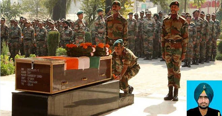 ಕುರುಕ್ಷೇತ್ರ, ಹರ್ಯಾಣ (ಅ.30): ಪಾಕಿಸ್ತಾನ ಸೈನಿಕರು ಹಾಗೂ ಉಗ್ರಗಾಮಿಗಳು ಜಂಟಿಯಾಗಿ ನಡೆಸಿದ ದಾಳಿಗೆ ಶುಕ್ರವಾರ ಹುತಾತ್ಮರಾದ ಮನ್ ದೀಪ್ ಸಿಂಗ್’ಗೆ ಇಂದು ಅಂತಿಮ ನಮನ ಸಲ್ಲಿಸಲಾಯಿತು.