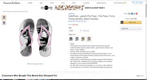 ಅಮೆಜಾನ್ ಡಾಟ್ ಕಾಂ ಶಾಪಿಂಗ್ ಪೋರ್ಟಲ್ನಲ್ಲಿ Gandhi Flip Flops – ಗಾಂಧಿ ಚಿತ್ರವಿರುವ ಚಪ್ಪಲಿ ಮಾರಾಟಕ್ಕಿಟ್ಟಿದ್ದು ಇದರ ಬೆಲೆ 16.99 ಡಾಲರ್ (₹1157.44) ಆಗಿದೆ.