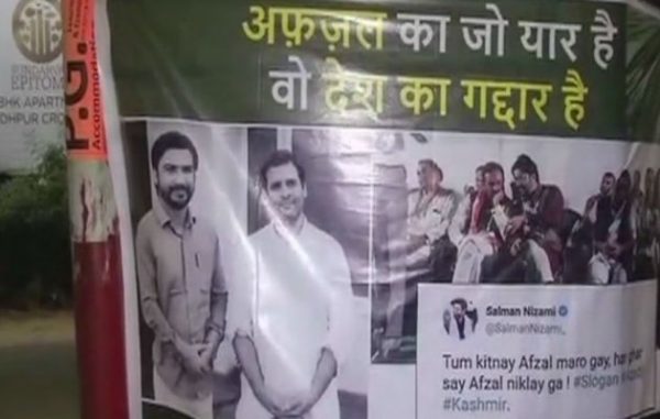 ಕಾಂಗ್ರೆಸ್‌ ಉಪಾಧ್ಯಕ್ಷ ರಾಹುಲ್‌ ಗಾಂಧಿ ಜತೆಗೆ ಸಲ್ಮಾನ್‌ ನಿಜಾಮಿ ನಿಂತುಕೊಂಡಿರುವ ಪೋಸ್ಟರ್‌ನಲ್ಲಿ ಈ ರೀತಿಯ ಬರಹ ಕಂಡು ಬಂದಿದೆ : ಜೋ ಅಫ್ಜಲ್‌ ಗುರು ಕಾ ಯಾರ್‌ ಹೈ, ವೋ ದೇಶ್‌ ಕಾ ಗದ್ದಾರ್‌ ಹೈ (ಯಾರು ಅಫ್ಜಲ್‌ ಗುರುವಿನ ಮಿತ್ರನೋ ಅವನು ದೇಶದ್ರೋಹಿ).