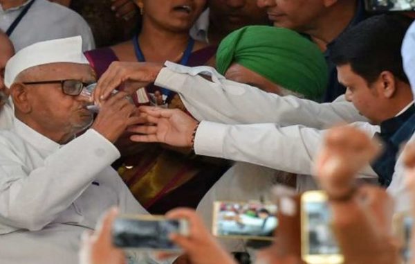 ಮಹಾರಾಷ್ಟ್ರ ಮುಖ್ಯಮಂತ್ರಿ ದೇವೇಂದ್ರ ಫಡ್ನವೀಸ್ ಅವರ ಭೇಟಿಯೊಂದಿಗೆ. ಅಣ್ಣಾ ತಮ್ಮ ನಿರಶನ ಸತ್ಯಾಗ್ರಹವನ್ನು ಕೊನೆಗೊಳಿಸಿದರು.