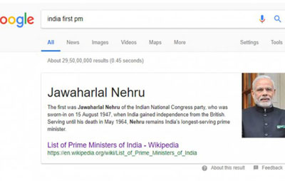 ಭಾರತದ ಮೊದಲ ಪ್ರಧಾನಿ ಎಂಬ ಗೂಗಲ್ ಸರ್ಚ್ ಫಲಿತಾಂಶದಲ್ಲಿ ಜವಾಹರಲಾಲ್ ನೆಹರೂ ಅವರ ಹೆಸರು ವಿಕಿಪೀಡಿಯಾದ “ಲಿಸ್ಟ್ ಆಫ್ ಪ್ರೈಮ್ ಮಿನಿಸ್ಟರ್’ ಲಿಂಕ್ ನಲ್ಲಿ ಕಾಣಿಸಿಕೊಳ್ಳುತ್ತದೆ; ಆದರೆ ಫೋಟೋ ಮಾತ್ರ ನರೇಂದ್ರ ಮೋದಿಯವರದ್ದು ಕಾಣಿಸಿಕೊಳ್ಳುತ್ತದೆ.