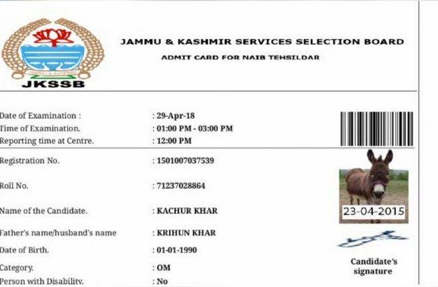 ಜಮ್ಮು ಮತ್ತು ಕಾಶ್ಮೀರ ಸೇವೆಗಳ ಆಯ್ಕೆ ಮಂಡಳಿ(ಜೆಕೆಎಸ್ಎಸ್ ಬಿ)ಯು ಕಚುರ್ ಖಾರ್ ಎಂಬ ಅಭ್ಯರ್ಥಿಯ ಪ್ರವೇಶ ಪತ್ರದಲ್ಲಿ ಕತ್ತೆಯ ಭಾವಚಿತ್ರ ಮುದ್ರಿಸಿ ಕಳುಹಿಸಿದೆ.