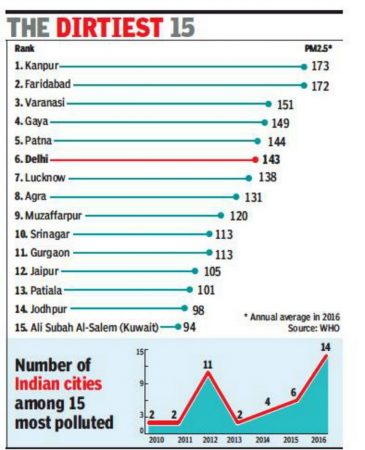 ಕಳೆದ ೨ ವರ್ಷಕ್ಕೆ ಹೋಲಿಸಿದಲ್ಲಿ ಹೊಸದಿಲ್ಲಿಯ ಪಿಎಂ 2.5 ಪ್ರಮಾಣ ಕೊಂಚ ಇಳಿಮುಖವಾಗಿದ್ದರೂ, ಹೆಚ್ಚು ಮಾಲಿನ್ಯ ಇರುವ ನಗರದ ಪಟ್ಟಿಯಿಂದ ಹೊರಬಿದ್ದಿಲ್ಲ. ಅತಿ ಹೆಚ್ಚು ಮಲಿನ ಗಾಳಿ ಹೊಂದಿರುವ ನಗರಗಳ ಪೈಕಿ ಬೆಂಗಳೂರು ಪಟ್ಟಿಗೆ ಸೇರ್ಪಡೆಯಾಗಿಲ್ಲ.