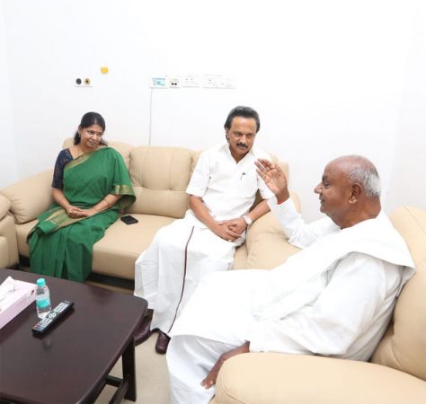 ನಂತರ ಕರುಣಾನಿಧಿ ಪುತ್ರ ಎಂ.ಕೆ. ಸ್ಟಾಲಿನ್ ಮತ್ತು ಪುತ್ರಿ ಕನಿಮೋಳಿ ಜತೆ ದೇವೇಗೌಡರು ಮಾತುಕತೆ ನಡೆಸಿದರು.
