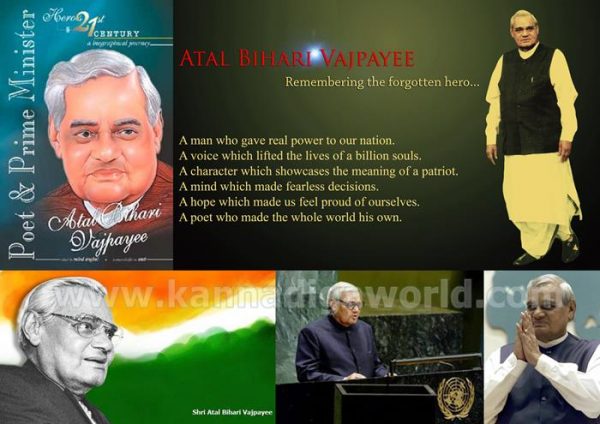 ವಿಶ್ವದ ಅತ್ಯುತ್ತಮ ನಾಯಕರ ಸಾಲಿನಲ್ಲಿ ಗೌರವಿಸಲ್ಪಡುವ ಸನ್ಮಾನ್ಯ ಅಟಲ್ ಬಿಹಾರಿ ವಾಜಪೇಯಿ ಸಕ್ರಿಯಾ ರಾಜಕಾರಣಿ, ಕವಿ, ಹೆಸರಾಂತ ಪತ್ರಕರ್ತ, ಶ್ರೇಷ್ಠ ವಾಗ್ಮಿ, ಚಿಂತಕ, ದಾರ್ಶನಿಕ, ನಿಸ್ವಾರ್ಥ ರಾಜಕಾರಣಿ, ನುಡಿದಂತೆ ನಡೆಯುವ ಮಾನವತಾವಾದಿಯು 16 ಆಗಸ್ 2018 ಇಹಲೋಕವನ್ನು ತ್ಯಜಿಸಿದ್ದಾರೆ. ಭಾರತ ದೇಶ ಕಂಡ ಅಪ್ರತಿಮ ದೇಶಭಕ್ತ ನಮ್ಮೆಲ್ಲರ ನೆಚ್ಚಿನ ಮಾಜಿ ಪ್ರಧಾನಿ ಸನ್ಮಾನ್ಯ ಅಟಲ್ ಬಿಹಾರಿ ವಾಜಪೇಯಿ ಅವರಿಗೆ ಅಂತಿಮ ನಮನಗಳನ್ನು ಸಲ್ಲಿಸಿ ಅವರು ನಡೆದು ಬಂದ ಹಾದಿಯ ಸಿಂಹಾವಲೋಕನದ ಹೆಜ್ಜೆ ಗುರುತಿನ ವಿಶೇಷ ಲೇಖನ…