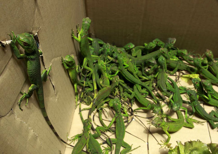 ಎರಡು ಹಸಿರು ಹೆಬ್ಬಾವುಗಳು ಮತ್ತು 14 ವಿವಿಧ ಜಾತಿಯ ಹಲ್ಲಿಗಳನ್ನು ವಶಪಡಿಸಿಕೊಳ್ಳಲಾಗಿದೆ.