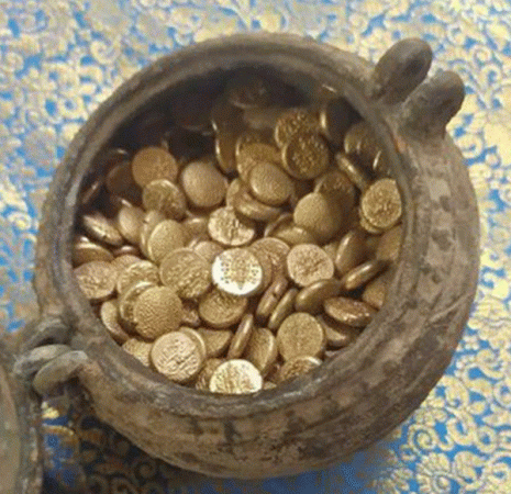 ಭೂಮಿ ಅಗೆಯುತ್ತಿದ್ದಾಗ 1.716 ಕೆ.ಜಿ. ತೂಕದ ಚಿನ್ನದ ನಾಣ್ಯ ತುಂಬಿರುವ ನಿಧಿ ಪತ್ತೆ