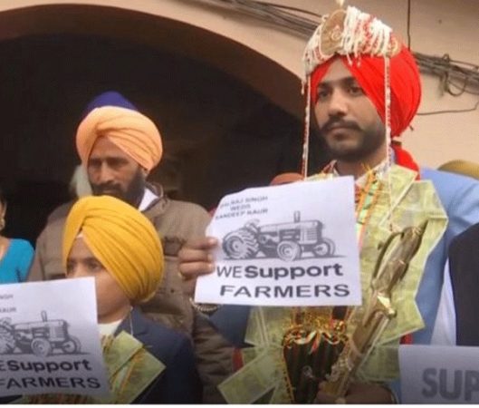 ಈ ಮಧ್ಯೆ, ಪ್ರತಿಭಟನಾನಿರತ ರೈತರನ್ನು ಭೇಟಿ ಮಾಡಿದ ಆತ ಭಿತ್ತಿಪತ್ರ ಹಿಡಿದು ರೈತರಿಗೆ ಬೆಂಬಲ ಸೂಚಿಸಿದ್ದಾನೆ. ಕುಟುಂಬ ವರ್ಗ ಸಹ ಮದುಮಗನ ಜೊತೆ ಭಿತ್ತಿಪತ್ರ ಪ್ರದರ್ಶಿಸುವ ಮೂಲಕ ರೈತರ ಹೋರಾಟಕ್ಕೆ ಬೆಂಬಲ ಸೂಚಿಸಿತು.