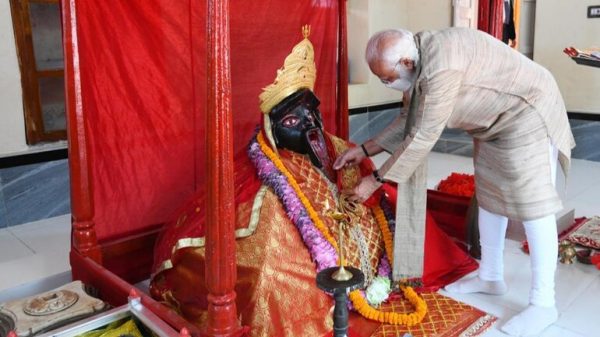 ಪೂಜೆ ಸಲ್ಲಿಸಿದ ಪ್ರಧಾನಿ ಕಾಳಿ ದೇವತೆಯ ಮೂರ್ತಿಗೆ ಮುಕುಟ ಧರಿಸಿದರು. ಹೊರಗೆ ಚಿನ್ನದ ಕವಚವಿರುವ ಬೆಳ್ಳಿ ಮುಕುಟ ಇದಾಗಿದ್ದು ಭಾರತದ ಸಾಂಪ್ರದಾಯಿಕ ಕಲಾವಿದರು ಇದನ್ನು ತಯಾರಿಸಲು ಮೂರು ವಾರ ತೆಗೆದುಕೊಂಡಿದ್ದರು.