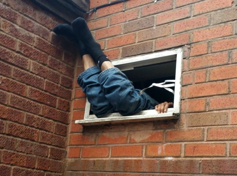 ಬರ್ಮಿಂಗ್‌ಹ್ಯಾಮ್‌ನ ರೆಸ್ಟೋರೆಂಟ್‌ಗೆ ಕನ್ನ ಹಾಕಲು 45 ವರ್ಷದ ವ್ಯಕ್ತಿ ವೆಂಟಿಲೇಟರ್‌ ಮೂಲಕ ಹತ್ತಿ ಒಳ ಸೇರಲು ಯತ್ನಿಸಿದ್ದಾನೆ. ಆದರೆ ಆತನ ಹೊಟ್ಟೆಯ ಭಾಗ ವೆಂಟಿಲೇಟರ್‌ ಸಂದಿಯೊಳಗೆ ಹೋಗಲಿಲ್ಲ. ಹೀಗಾಗಿ ಸುಮಾರು ಏಳು ಗಂಟೆಗಳ ಕಾಲ ಅಲ್ಲೇ ಸಿಲುಕಿಕೊಂಡು ಕಾಪಾಡುವಂತೆ ಬೊಬ್ಬೆಯಿಟ್ಟಿದ್ದಾನೆ.