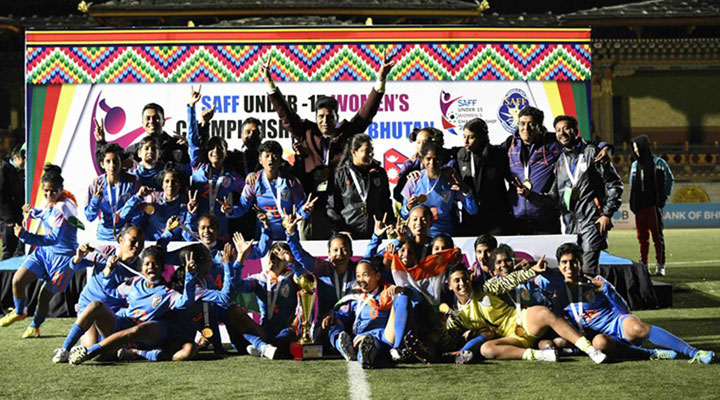 ಭೂತಾನ್: ಭಾರತದ ಮಹಿಳಾ ಫುಟ್ಬಾಲ್ ತಂಡವು ಇಲ್ಲಿ ನಡೆದಿರುವ ಅಂಡರ್-15 ಸ್ಯಾಫ್ ಫುಟ್ಬಾಲ್ ಚಾಂಪಿಯನ್ ಶಿಪ್ ಫೈನಲ್ ನ ಶೂಟೌಟ್ ನಲ್ಲಿ 5-3 ರಿಂದ ಬಾಂಗ್ಲಾದೇಶ ತಂಡವನ್ನು ಮಣಿಸಿ, ಪ್ರಶಸ್ತಿಗೆ ಮುತ್ತಿಟ್ಟಿದೆ.