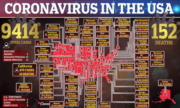 ಅಮೆರಿಕದಲ್ಲಿ 50 ರಾಜ್ಯದಲ್ಲಿ ಸೋಂಕು ಹರಡಿದ್ದು, 150 ಮಂದಿ ಸಾವನ್ನಪ್ಪಿದ್ದಾರೆ. ಸುಮಾರು 9,400 ಕೊರೊನಾ ದೃಢಪಟ್ಟ ಪ್ರಕರಣಗಳು ವರದಿಯಾಗಿದೆ.