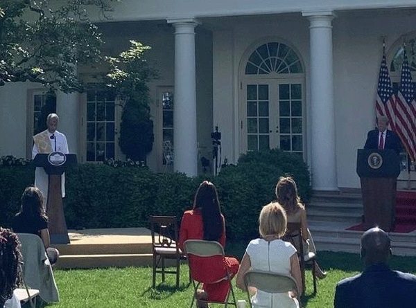 ನ್ಯೂಜೆರ್ಸಿಯ ಸ್ವಾಮಿನಾರಾಯಣ ದೇವಸ್ಥಾನದ ಪ್ರಧಾನ ಅರ್ಚಕ ಹರೀಶ್ ಬ್ರಹ್ಮಭಟ್ ಅವರು ಟ್ರಂಪ್ ಆಹ್ವಾನದ ಮೇರೆಗೆ ಶ್ವೇತಭವನದ ರೋಸ್ ಗಾರ್ಡನ್ನಲ್ಲಿ ವೇದ ಮಂತ್ರಗಳನ್ನು ಪಠಿಸಿದರು.