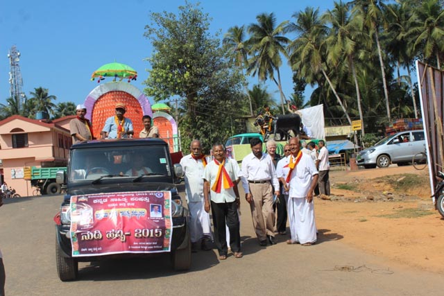 ಬಳಿಕ ಕರ್ನಾಟಕ ಬ್ಯಾಂಕಿನ ವಠಾರದಿಂದ ಪುಪ್ಪರಥ, ಜಾನಪದ ನೃತ್ಯ, ವಿವಿಧ ಸ್ತಬ್ದಚಿತ್ರಗಳು, ಕವಾಯತುಗಳೊಂದಿಗೆ ಡಾ ಕಾರಂತ ಬೀದಿಯ ಮೂಲಕ ಸಾಗಿಬಂದ ಮೆರವಣಿಗೆ ಸಮ್ಮೇಳನದ ಆವರಣವನ್ನು ಪ್ರವೇಶಿಸಿದ ಮೆರವಣಿಗೆಗೆ ಸಾಲಿಗ್ರಾಮ ಶ್ರೀ ಗುರುನರಸಿಂಹ ದೇವಸ್ಥಾನದ ಆಡಳಿತ ಮುಕ್ತೇಸರರಾಗಿ ಐರೋಡಿ ಜಗದೀಶ ಕಾರಂತ ಚಾಲನೆ ನೀಡಿದರು.