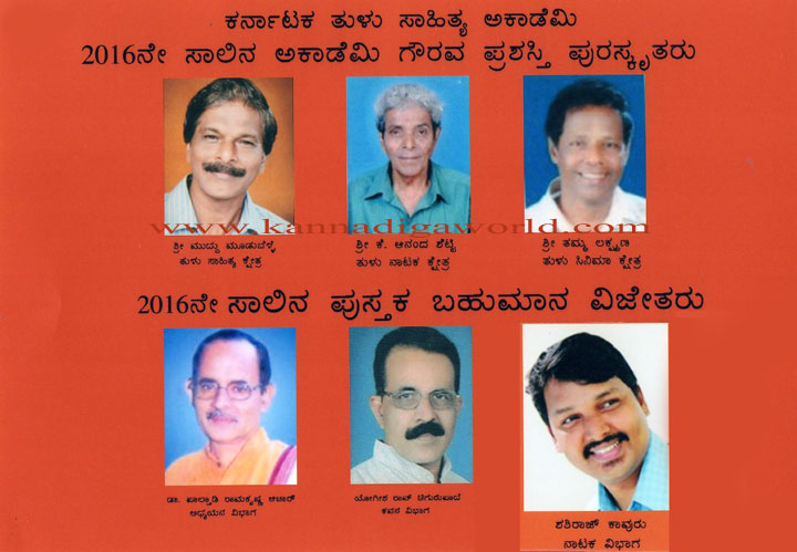 ತುಳು ಸಾಹಿತ್ಯ ಕ್ಷೇತ್ರ, ತುಳು ನಾಟಕ ಕ್ಷೇತ್ರ ಹಾಗೂ ತುಳು ಸಿನಿಮಾ ಕ್ಷೇತ್ರಗಳಲ್ಲಿ ಅನನ್ಯ ಸೇವೆ ಸಲ್ಲಿಸಿದ ಮೂರು ಜನ ಗಣ್ಯರನ್ನು ಅಕಾಡೆಮಿಯ 2016ರ ಗೌರವ ಪ್ರಶಸ್ತಿಗಾಗಿ ಆಯ್ಕೆ ಮಾಡಲಾಗಿದೆ.