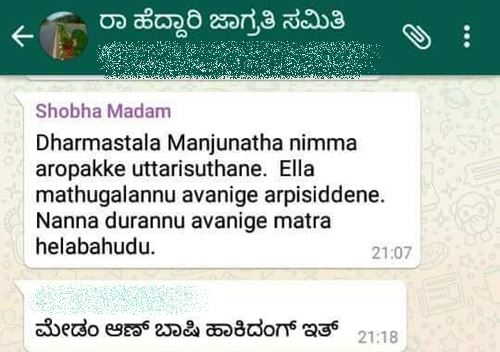 ‘ಧರ್ಮಸ್ಥಳ ಮಂಜುನಾಥ ನಿಮ್ಮ ಆರೋಪಕ್ಕೆ ಉತ್ತರಿಸುತ್ತಾನೆ, ಎಲ್ಲಾ ಮಾತುಗಳನ್ನು ಅವನಿಗೆ ಅರ್ಪಿಸಿದ್ದೇನೆ. ನನ್ನ ದೂರನ್ನು ಅವನಿಗೆ ಮಾತ್ರ ಹೇಳಬಹುದು’ ಎಂಬ ವಿವದಾತ್ಮಕ ಹೇಳಿಕೆಯನ್ನು ವಾಟ್ಸಾಪ್ ಗ್ರೂಫಿನಲ್ಲಿ ಹಾಕಿದ ಶೋಭಾ ಕರಂದ್ಲಾಜೆ ವಿರುದ್ದ ಈಗ ಎಲ್ಲರೂ ಆಕ್ರೋಷಗೊಂಡಿದ್ದಾರೆ. ಅಲ್ಲದೇ ಈ ಹೇಳಿಕೆ ಬಗ್ಗೆ ವಿರೋಧ ಪಕ್ಷಗಳಿಗಿಂತಲೂ ಬಿಜೆಪಿಯಿಂದಲೇ ಶೋಭಾ ವಿರುದ್ಧ ಹೆಚ್ಚು ಕೇಳಿಬರುತ್ತಿವೆ.