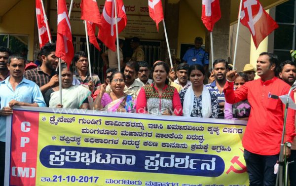 ಮಂಗಳೂರು, ಅಕ್ಟೋಬರ್.21: ಮಂಗಳೂರು ಮಹಾನಗರ ಪಾಲಿಕೆಯು ಕಾರ್ಮಿಕರನ್ನು ಡ್ರೈನೇಜ್ ಗುಂಡಿಗೆ ಇಳಿಸಿ ಕೆಲಸ ಮಾಡಿಸಿರುವ ಹಿನ್ನೆಲೆಯಲ್ಲಿ ಪಾಲಿಕೆಯ ವಿರುದ್ಧ ಸಿಪಿಎಂ ಮಂಗಳೂರು ನಗರ ಸಮಿತಿ ಇಂದು ಬೆಳಗ್ಗೆ ಪಾಲಿಕೆ ಕಚೇರಿಯೆದುರು ಪ್ರತಿಭಟನೆ ನಡೆಸಿತು.