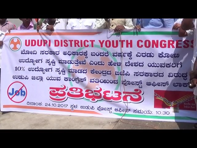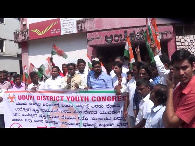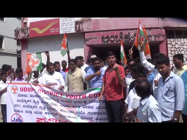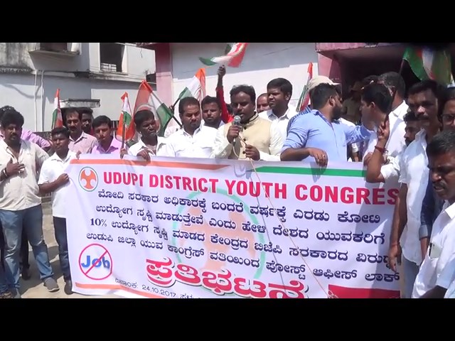 ಉಡುಪಿಯ ಪ್ರದಾನ ಅಂಚೆ ಕಚೇರಿ ಎದುರು ನಡೆದ ಪ್ರತಿಭಟನೆಯಲ್ಲಿ ಉದ್ಯೋಗ ಸೃಷ್ಟಿಸದದೇ ದೇಶದ ಯುವಕರನ್ನು ವಂಚಿಸುತ್ತಿರುವ ಕೇಂದ್ರದ ವಿರುದ್ದ ಘೋಷಣೆ ಕೂಗಲಾಯಿತು. ಪ್ರತಿಭಟನೆ ಉದ್ದೇಶಿಸಿ ಮಾತನಾಡಿದ ರಾಜ್ಯ ಯುವ ಕಾಂಗ್ರೆಸ್ ಕಾರ್ಯದರ್ಶಿ ಉಮೇಶ್ ಬೋರೆಗೌಡ ವರ್ಷಕ್ಕೆ ಎರಡು ಕೋಟಿ ಉದೋಗದ ಭರವಸೆ ನೀಡಿ ಅಧಿಕಾರಕ್ಕೆ ಬಂದ ಕೇಂದ್ರ ಸರಕಾರ ಕನಿಷ್ಟ ೧೦ ಶೇಕಡಾ ಉದ್ಯೋಗ ಸೃಷ್ಟಿಸದೇ ದೇಶದ ಯುವಕರನ್ನು ವಂಚಿಸುತ್ತಿದೆ. ಈ ಹಿಂದೆ ಯುಪಿಎ ಸರಕರವನ್ನು ಟೀಕಿಸುತ್ತಿದ್ದ ಬಿಜೆಪಿಗರು ಇದೀಗ ಯಾಕೆ ಮೌನಿಯಾಗಿದ್ದಾರೆ? ಇದೇ ರೀತಿಯಾದಲ್ಲಿ ದೇಶದ ಯುವಕರೇ ಮೋದಿಗೆ ತಕ್ಕ ಪಾಠ ಕಲಿಸುತ್ತಾರೆ. ಆದಷ್ಟು ಬೇಗ ಎಚ್ಚೆತ್ತುಕೊಳ್ಳಿ ಎಂದು ಆಗ್ರಹಿಸಿದರು.